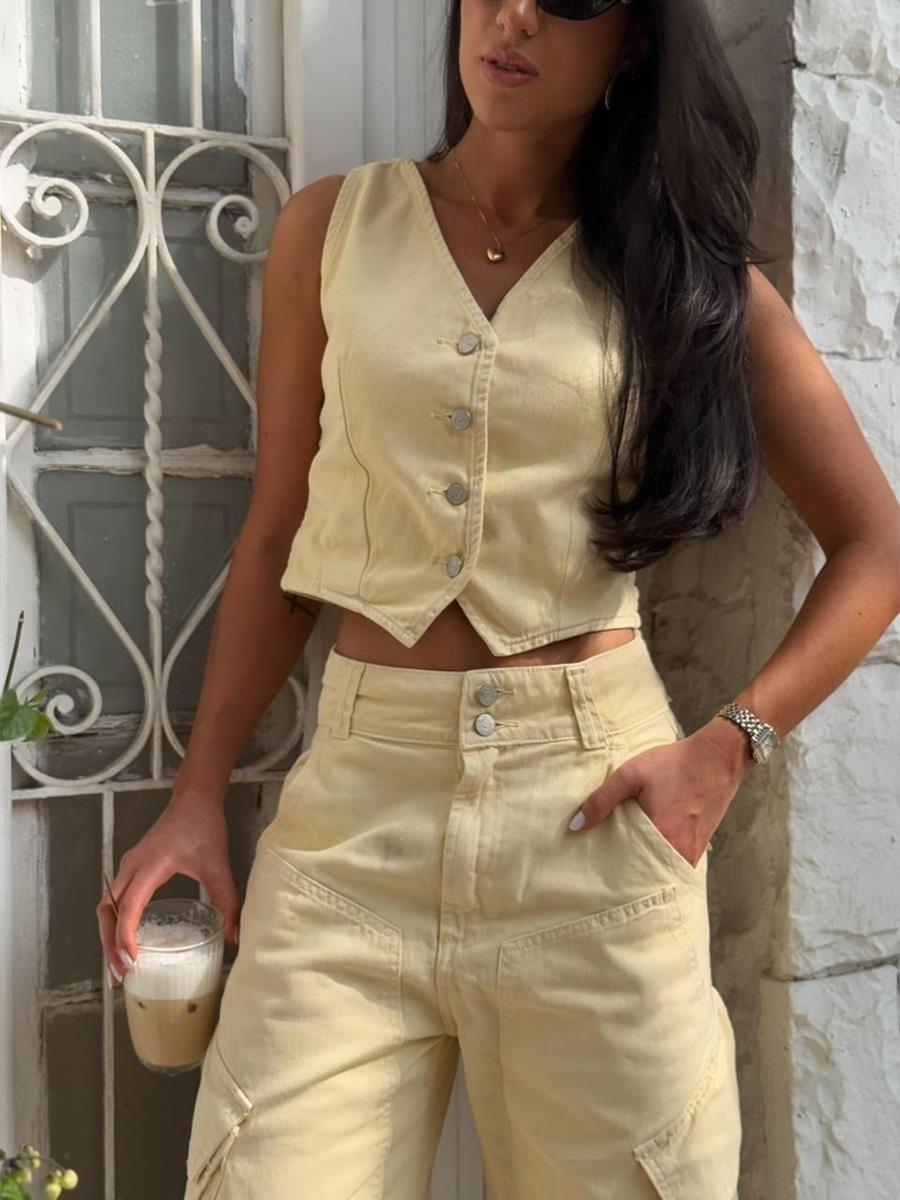 O colete Indie é a uma nova proposta de colete. A peça possui alças largas, pregas na frontal, fechamento por botão, modelagem de alfaiataria. A peça pode fazer conjunto com a super wide, perfeita para usar com salto fino e maxi acessórios.