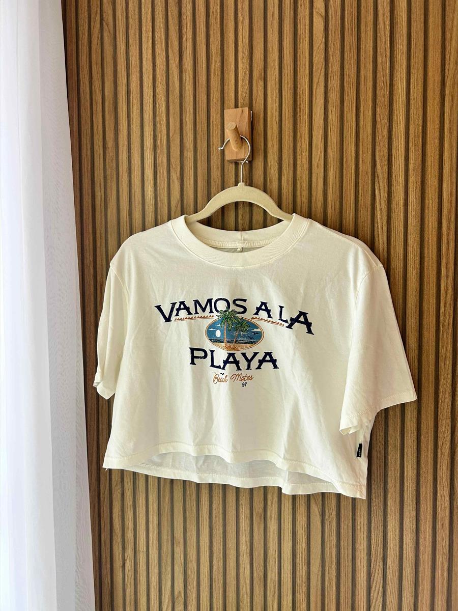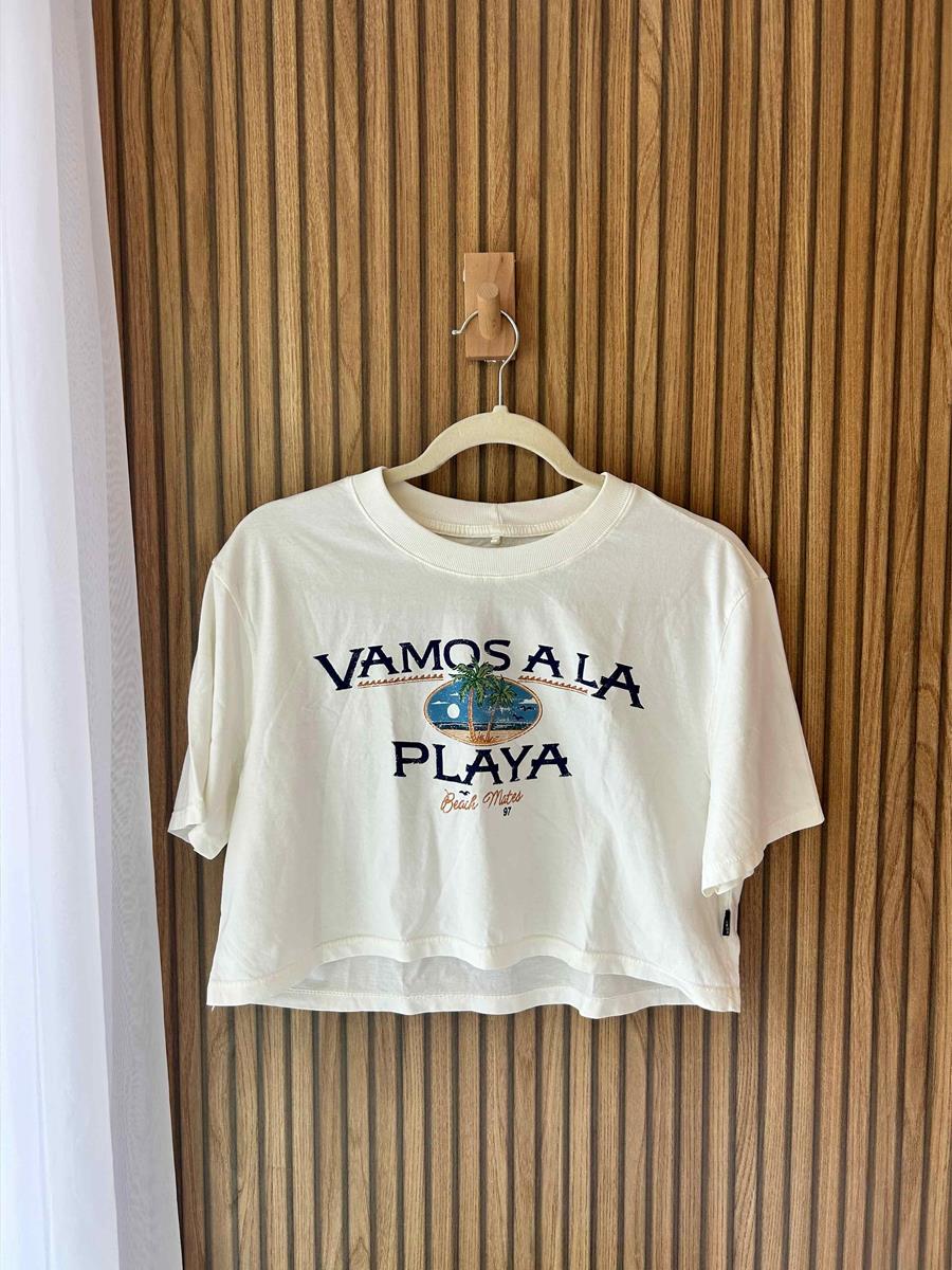 Feito em 100% algodão, garante conforto e frescor em qualquer ocasião. A escrita “Vamos a la playa” traz aquele ar divertido e descolado, perfeito para quem ama moda com personalidade. Combine com shorts, saias ou calças e leve o clima da praia para o seu dia a dia.